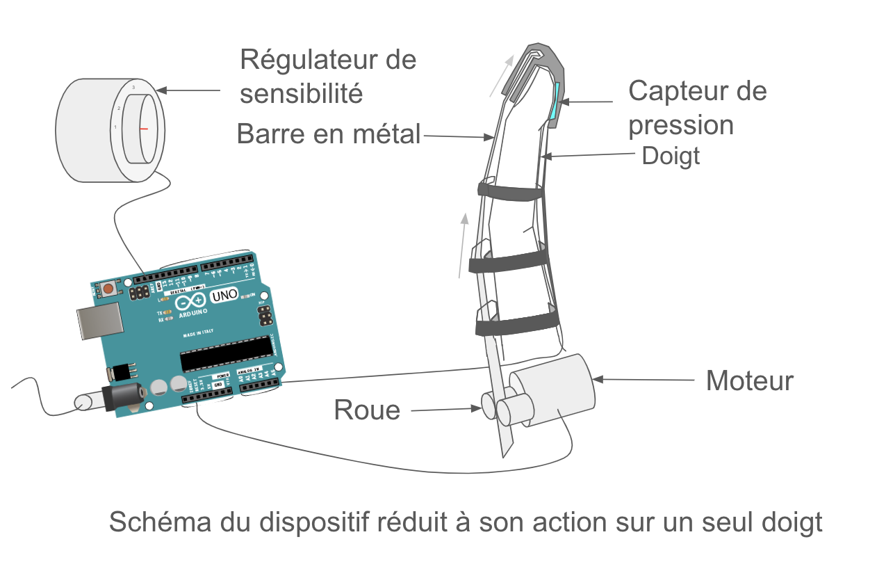 Pour rappel, voici l'idée de dispositif que nous avions envisagée. Lors de notre analyse initiale, nous avons remarqué la complexité de sa mise en œuvre, en raison de la multitude de composantes impliquées : rééducation, ergonomie, adaptabilité, utilisation de capteurs et de régulateurs, entre autres. Face à cette constatation, nous avons décidé d'opter pour une approche plus simple.