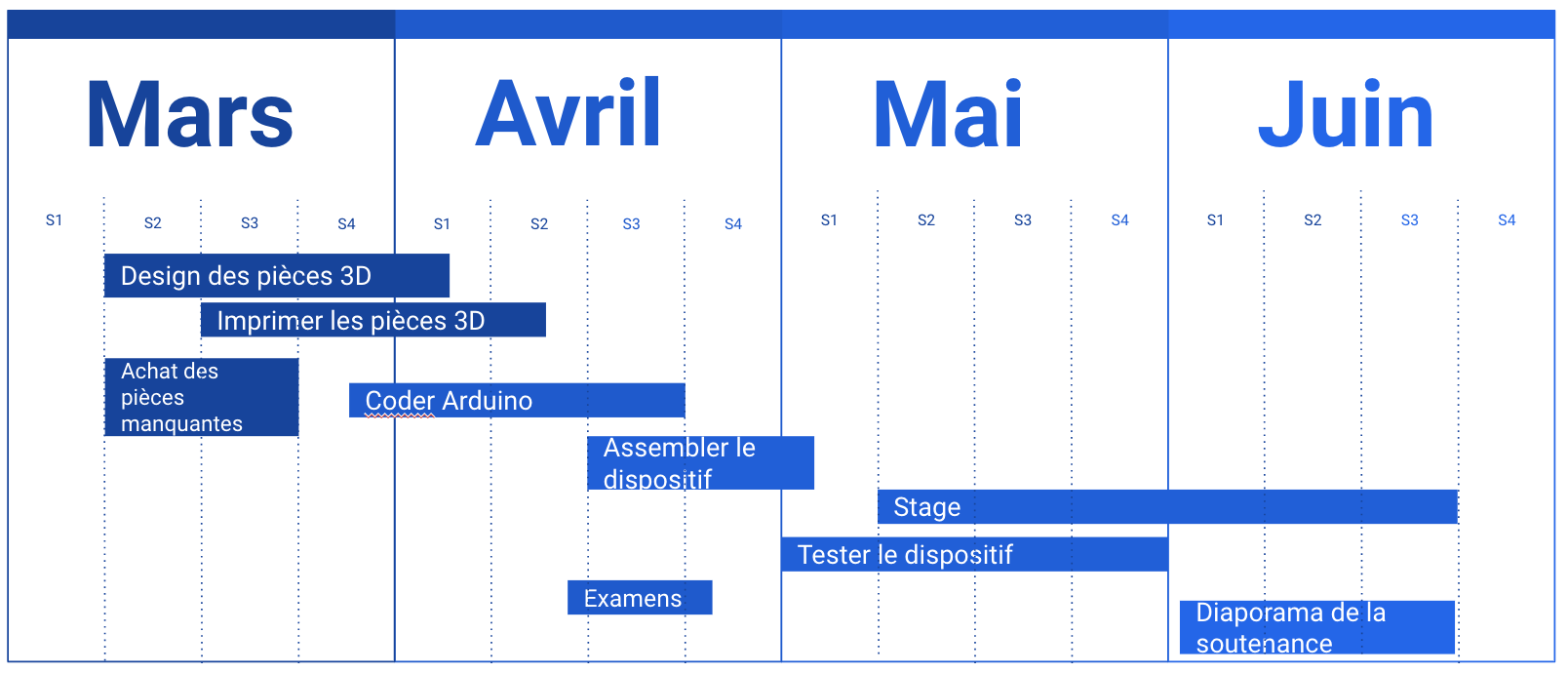 Nous pouvons approfondir la planification des étapes de conception et d'impression des pièces 3D, ainsi que du codage Arduino, car ces processus impliquent l'utilisation de machines qui, même si nous les avons déjà utilisées, peuvent nécessiter du temps supplémentaire et potentiellement ralentir l'avancement de notre dispositif.